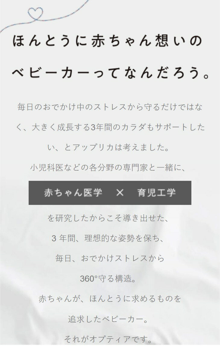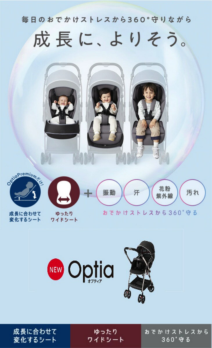 赤ちゃんが、ほんとうに求めるものを追求したベビーカー、それがオプティアです。