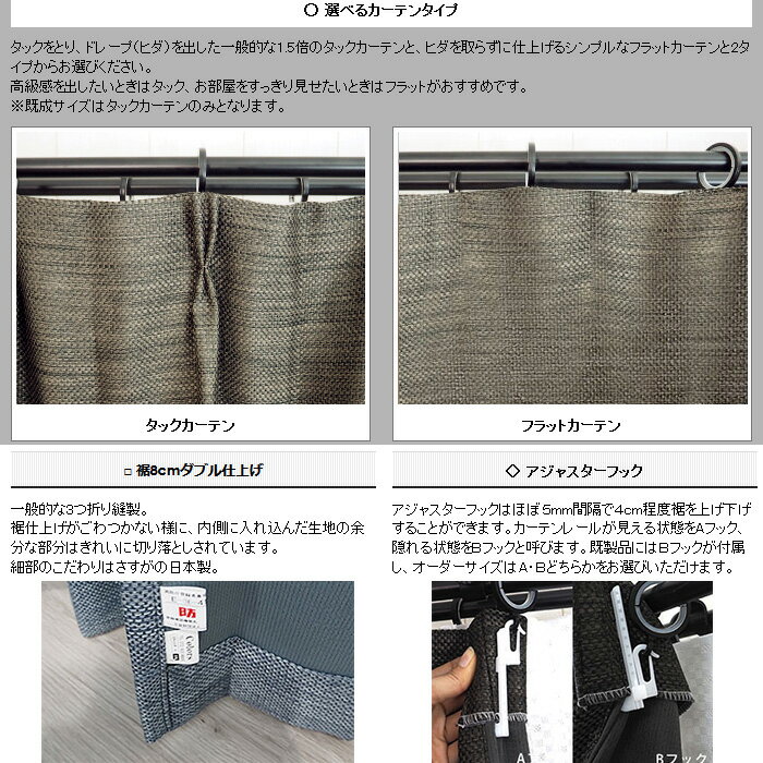 付属品 ・アジャスターフック(AタイプorBタイプ 選択可) 【1枚あたり】 幅〜102cm・・・7コ / 幅〜153cm・・・9コ / 幅〜200cm・・・13コ / 幅〜250cm・・・17コ / 幅〜300cm・・・19コ ・共布タッセル (1本) ご注意 返品・交換はできませんので予め、確認の上、ご購入ください。