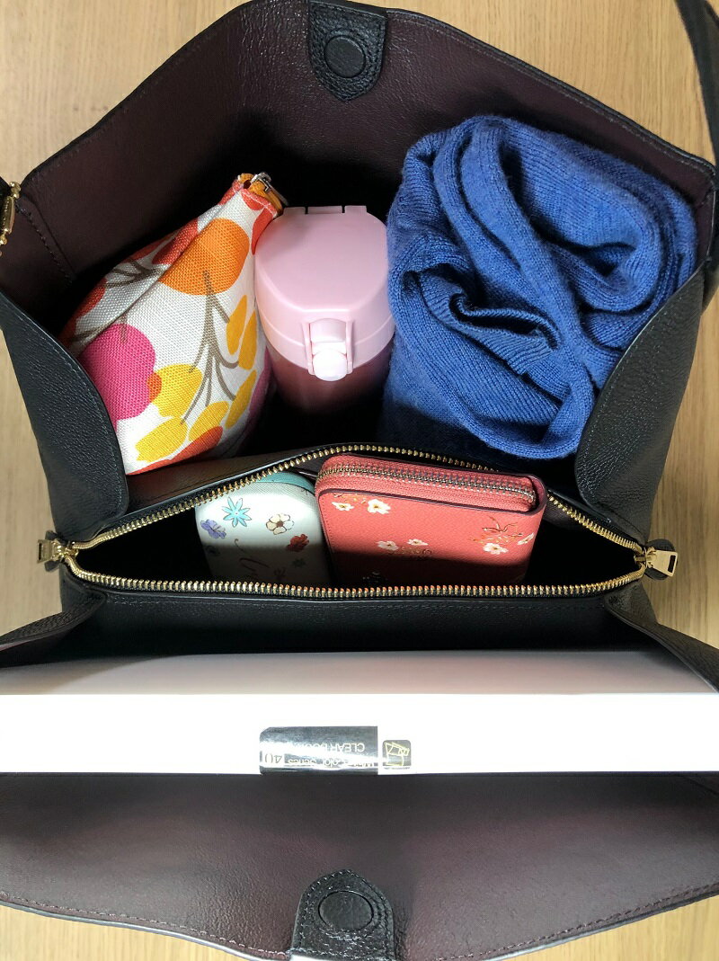 バッグ上部中央マグネット開閉タイプで、貴重品や身の回りの物を安全に入れられる中央のファスナー付きコンパートメントを設けているのでとても便利です。