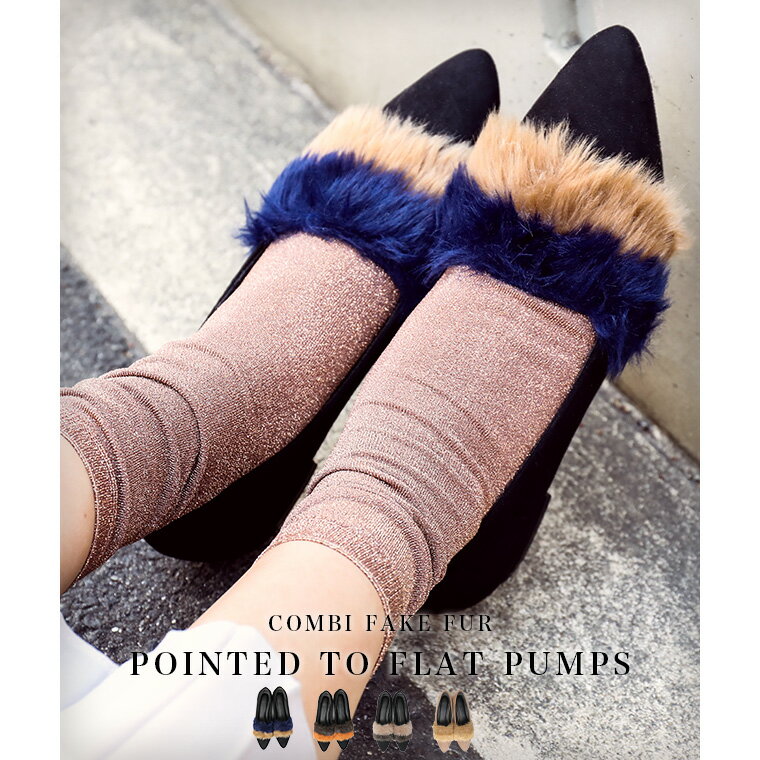 【送料無料】フラットパンプス ファー パンプス ファーパンプス ローヒール 黒 ファー パンプス コンビファー 秋 冬 パンプス 痛くない 歩きやすい 立ち仕事靴 通勤 オフィス カジュアル ぺたんこ ベージュ オーク ブラウン ブルー オレンジ ブラック